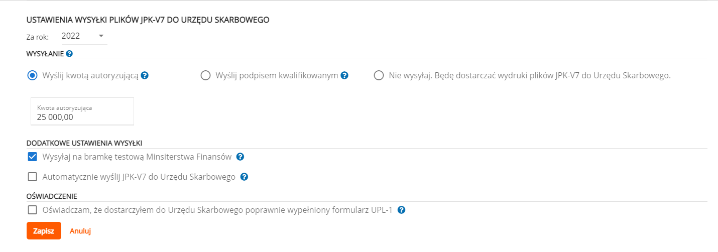 Zakładka Ustawienia wysyłki do Urzędu Skarbowego służy do sparametryzowania ustawień wysyłki pliku JPK_V7 oraz deklaracji VAT UE do Urzędu Skarbowego.