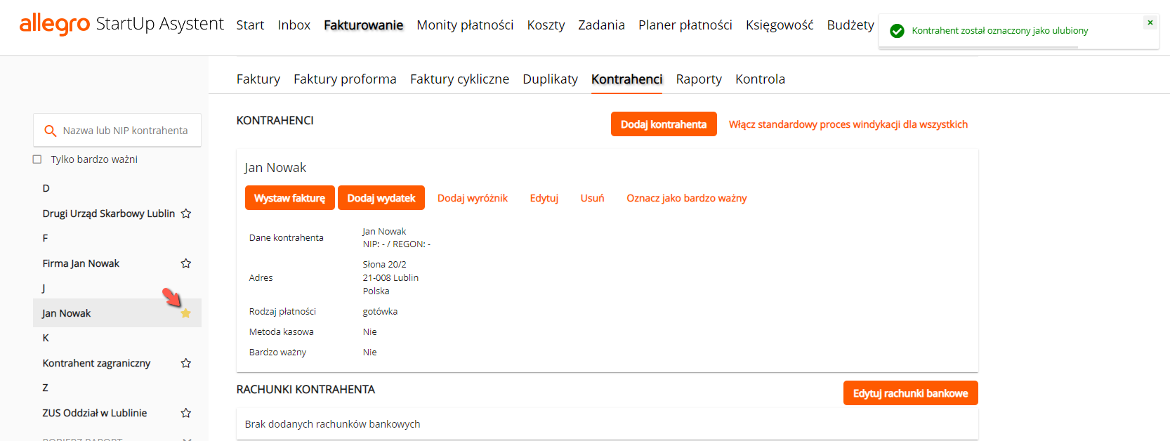 - Kliknąć w gwiazdkę znajdująca się obok nazwy kontrahenta, wówczas zmieni ona kolor na żółty i pojawi się komunikat Kontrahent został oznaczony jako ulubiony.