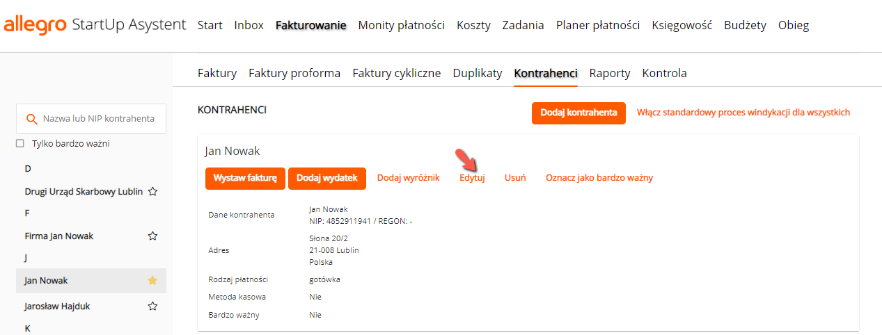 Aby dokonać edycji wprowadzonego wcześniej kontrahenta należy: