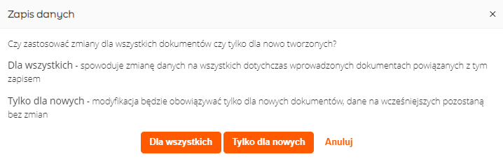 6. Należy wybrać jeden z widocznych komunikatów: zmiana dla wszystkich lub tylko na nowych dokumentach