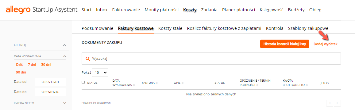 W systemie Allegro Startup Asystent faktury korygujące kosztowe nie są powiązane z fakturami, które korygują. Należy wprowadzić je analogicznie jak faktury kosztowe z odpowiednim znakiem.