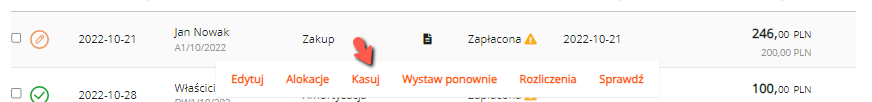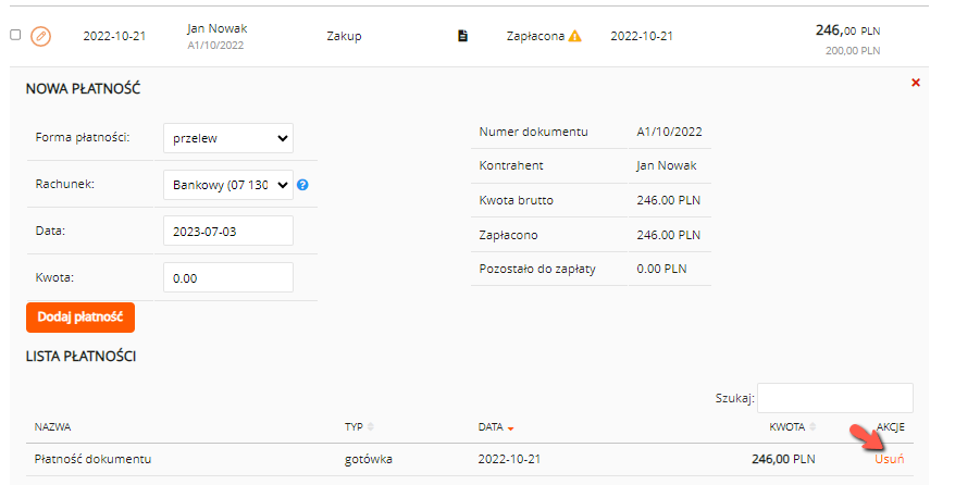 W takiej sytuacji przed usunięciem faktury należy usunąć płatność, poprzez wybór opcji Rozliczenia i przycisku Usuń w kolumnie Akcje.