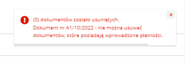 System uniemożliwi usunięcie opłaconego dokumentu, pojawi się wówczas komunikat:
