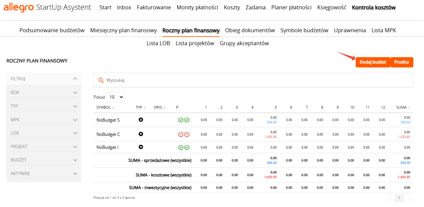 W zakładce Roczny plan finansowy można zdefiniować budżet poprzez wybranie przycisku Dodaj budżet.