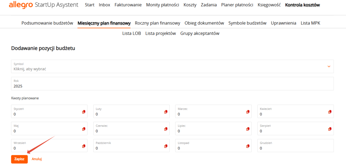 W celu stworzenia pozycji budżetu należy utworzyć Symbol budżetu.