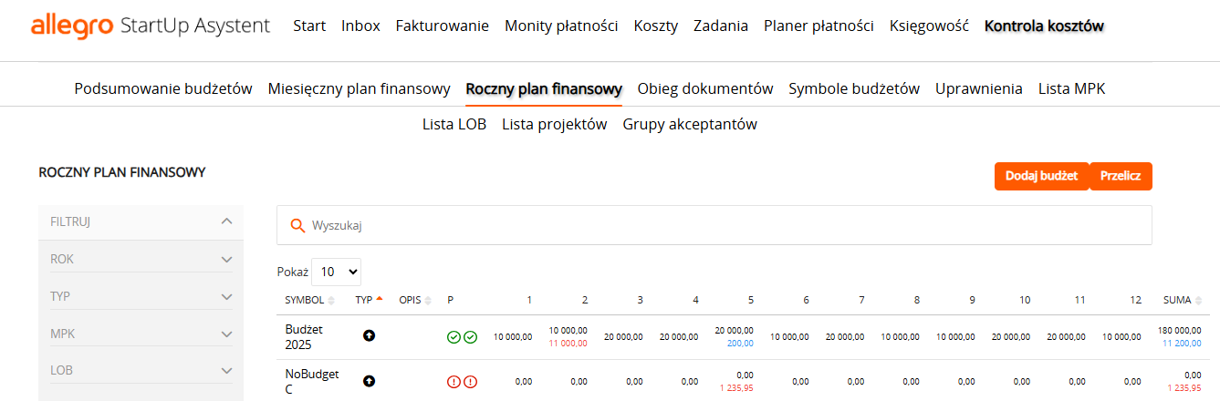 Na liście z budżetami widoczne są wartości w kolorze niebieskim oraz czerwonym: