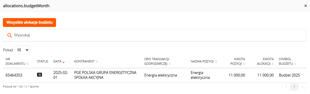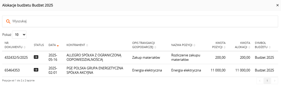 Wówczas na liście będą widoczne wszystkie dokumenty dotyczące danego budżetu.