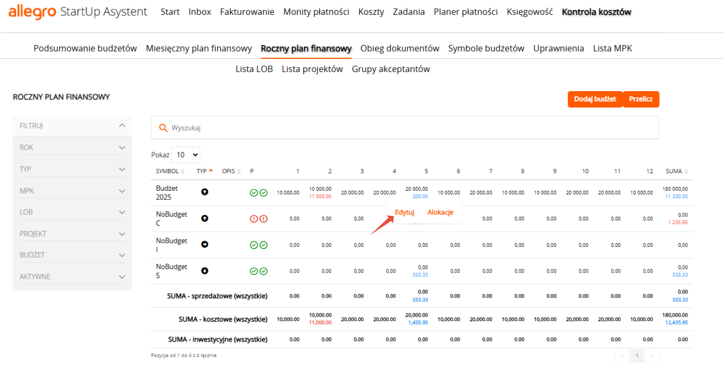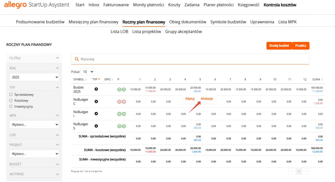 Istnieje również możliwość skorzystania z przycisku Alokacje.