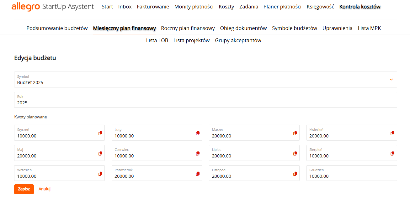 Po wybraniu przycisku Edytuj można dokonać szybkiej zmiany planu dla budżetu, poprzez zaktualizowane kwoty dla wybranego miesiąca.