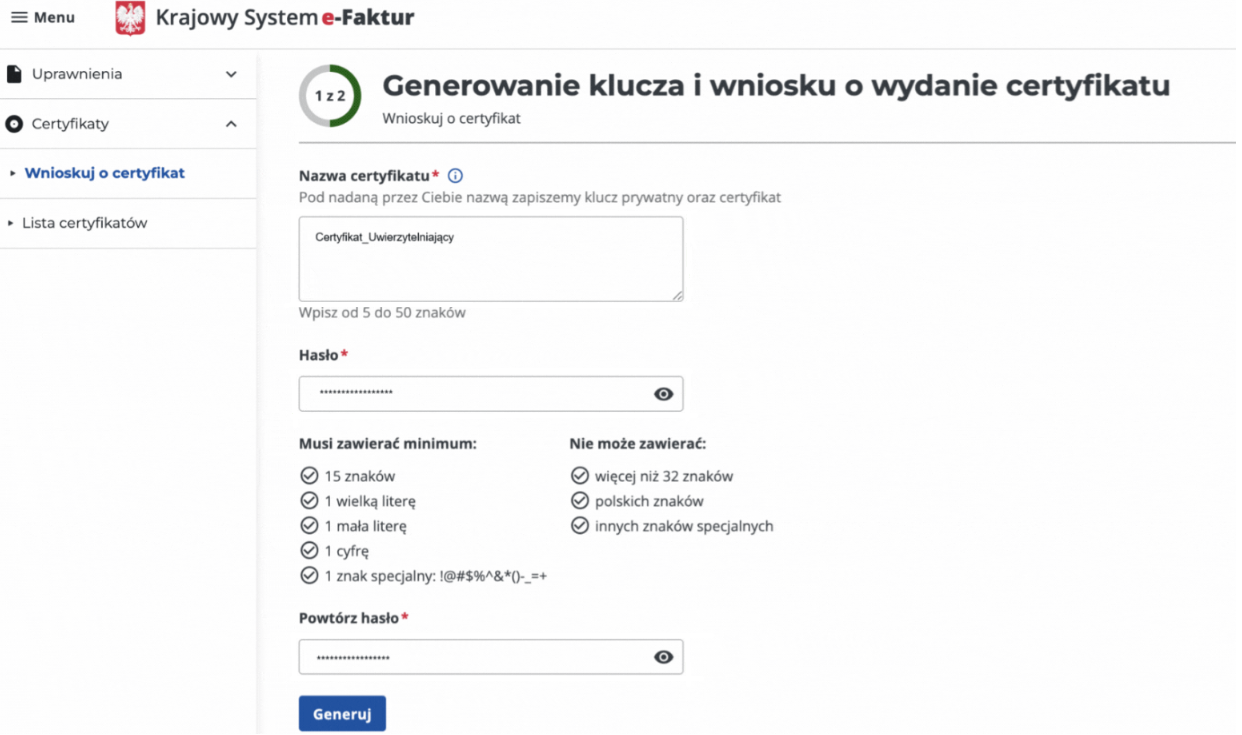 9. Wypełnij dane certyfikatu. Wymagane jest wprowadzenie Nazwy certyfikatu oraz utworzenie Hasła, które będzie zabezpieczać klucz prywatny oraz Powtórz hasło. Wybierz opcję Generuj. Klucz prywatny zostanie automatycznie zapisany na Twoim urządzeniu jako plik z rozszerzeniem .key.