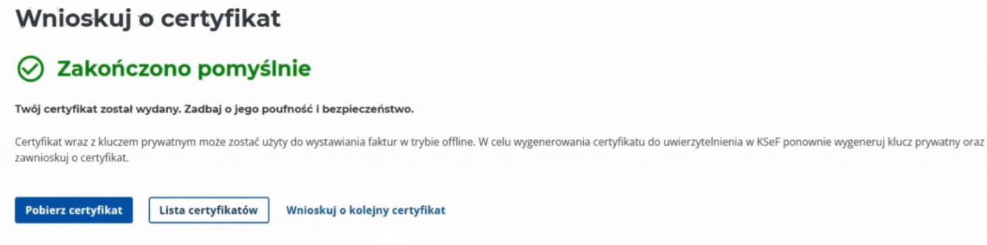 7. Po poprawnym wydaniu certyfikatu pojawi się komunikat o zakończeniu procesu. Masz wtedy trzy możliwości: