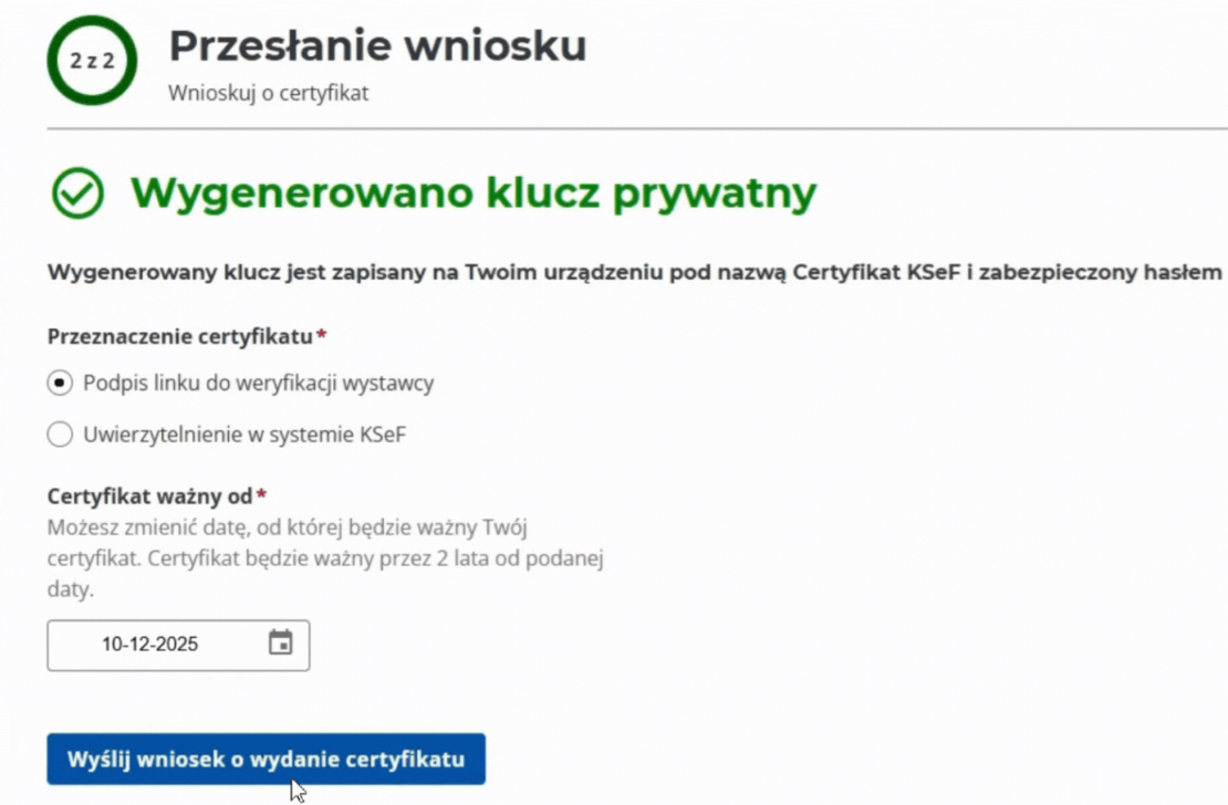 6. Po wypełnieniu kliknij Wyślij wniosek o wydanie certyfikatu - uruchomi to proces wydawania certyfikatu KSeF. Proces może potrwać kilka minut. Możesz użyć przycisku Odśwież, aby sprawdzić status.
