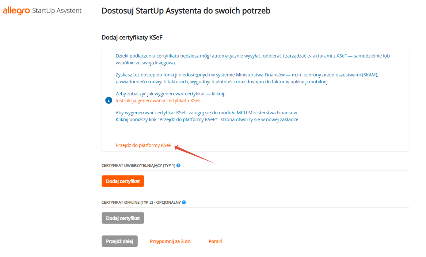 Na koniec wybierz opcję Przejdź dalej. Gotowe. System Allegro StartUp Asystent jest już połączony z KSeF.