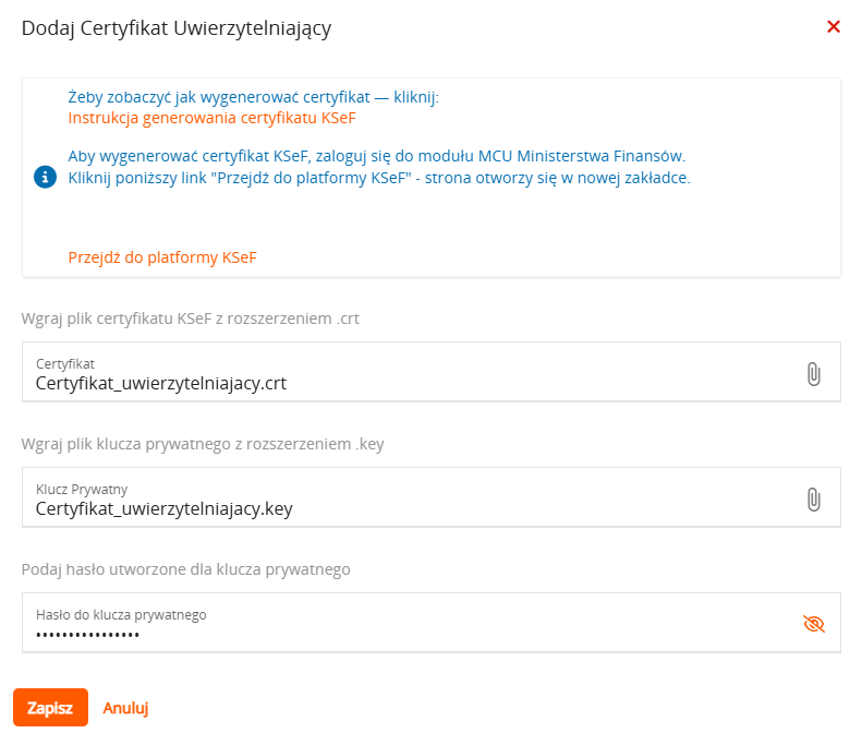 Wgraj certyfikat w formacie .crt, który został wygenerowany w Module Certyfikatow i Uprawnień z przeznaczeniem certyfikatu do Uwierzytelnienia w systemie KSeF. Załącz klucz prywatny w formacie .key. Wprowadź również Hasło do klucza prywatnego, które zostało zdefiniowane podczas generowania certyfikatu oraz zapisz zmiany.
