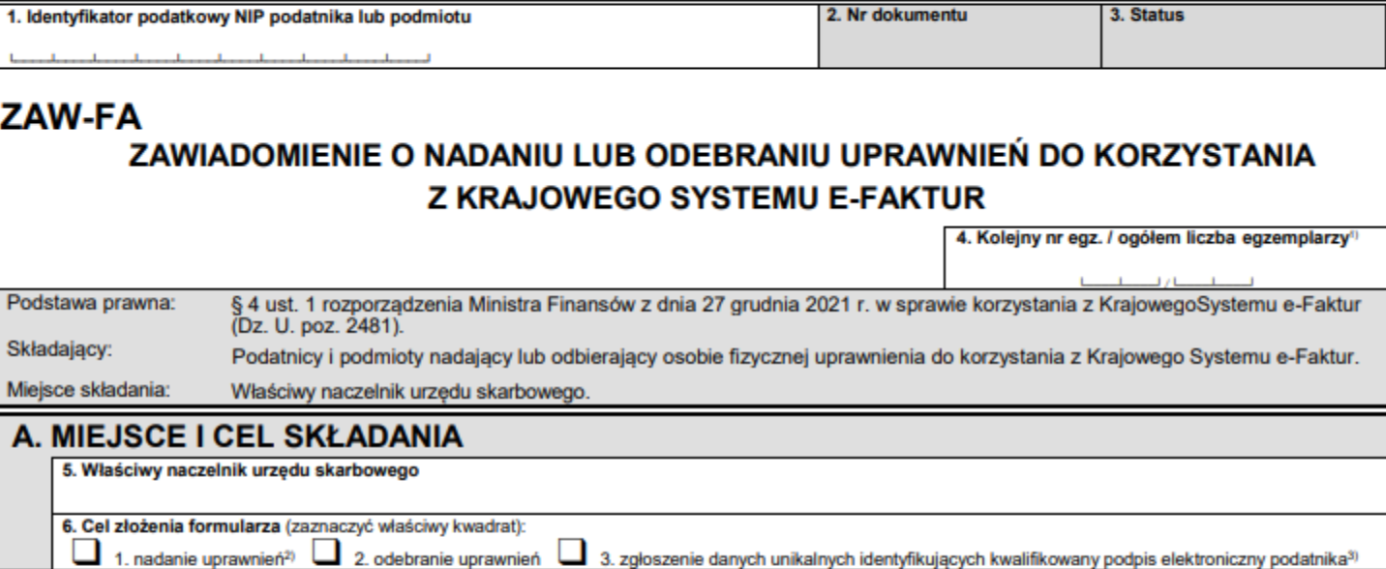 Zawiadomienie ZAW-FA to formularz składany do właściwego naczelnika urzędu skarbowego informujący o nadaniu lub odebraniu uprawnień do korzystania z Krajowego Systemu e-Faktur w imieniu spółki.