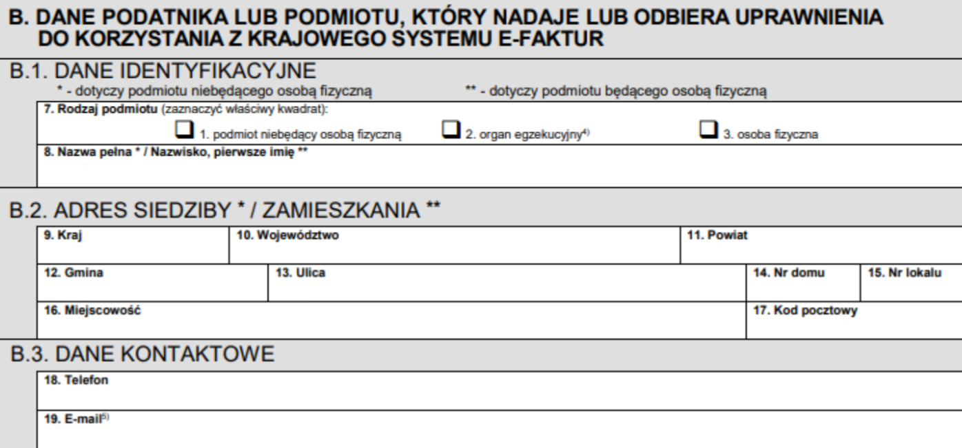 W części B uzupełnij dane podatnika lub podmiotu, który nadaje lub odbiera uprawnienia do korzystania z KSeF.