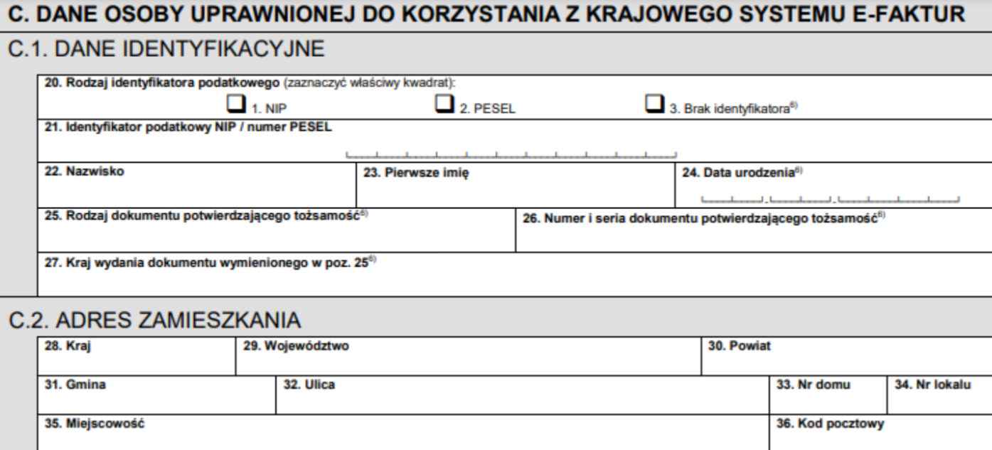 - "nadanie uprawnień" oraz osoba uprawniona do korzystania z KSeF została wymieniona w części C, nie posiada numeru NIP i numeru PESEL oraz posiada wyłącznie kwalifikowany podpis elektroniczny niezawierający numeru NIP i numeru PESEL,