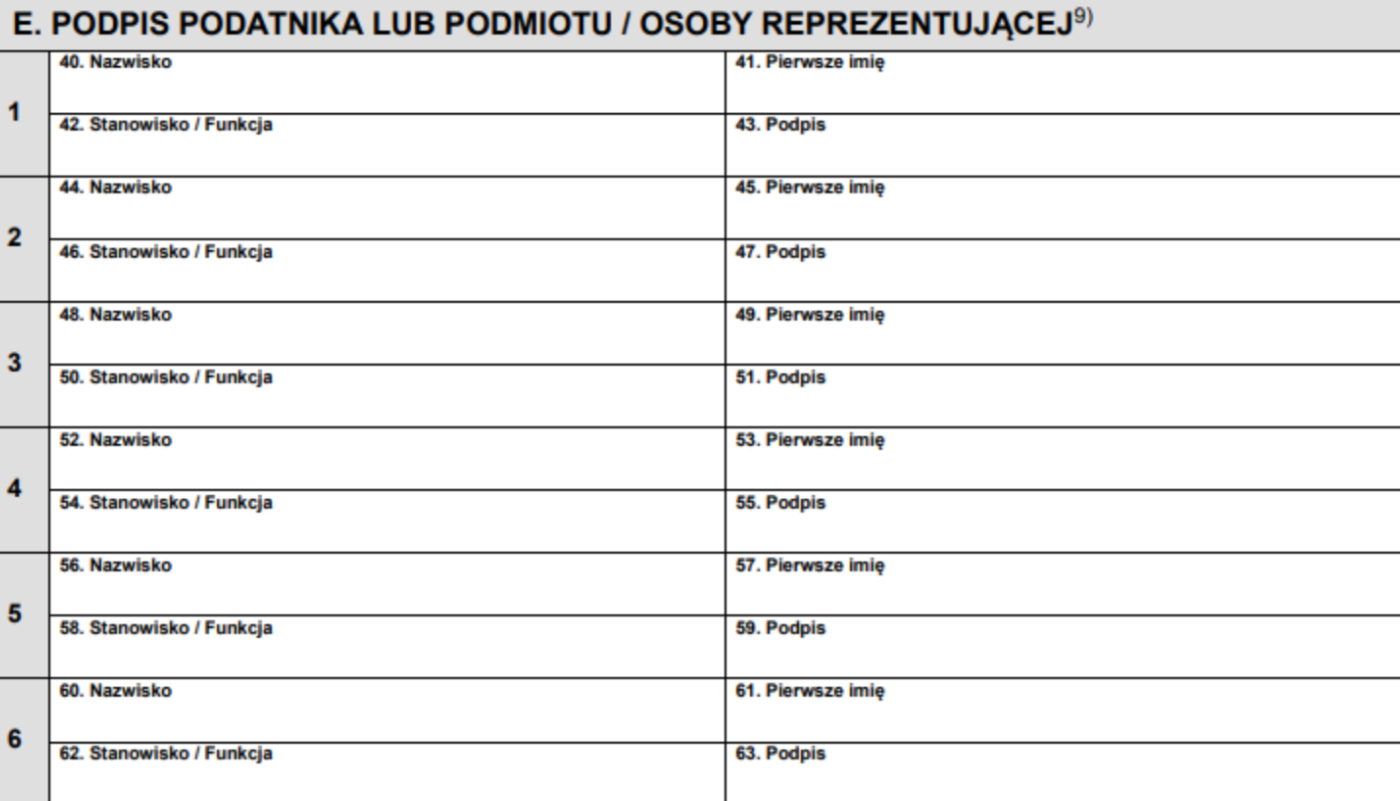 W części E złóż swój podpis jako podatnik, podmiot lub osoba reprezentująca, która nadaje lub odbiera uprawnienie w KSeF.