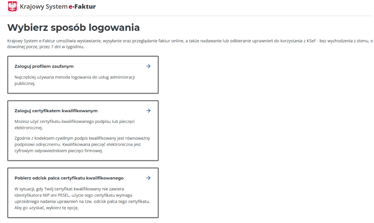 Uwaga: Firmy rozliczające się na zasadach pełnej księgowości (spółki z. o. o, spółki kapitałowe) mają możliwość logowania się do platformy KSeF używając kwalifikowanej pieczęci elektronicznej.
