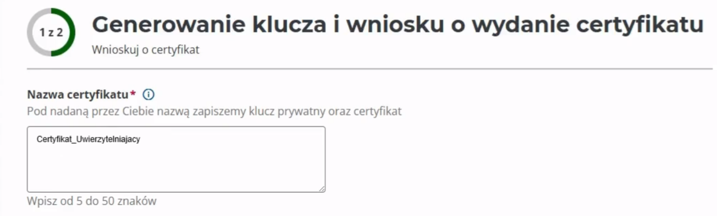 Na ekranie Generowanie klucza i wniosku o wydanie certyfikatu system wygeneruje dla Ciebie parę kluczy: