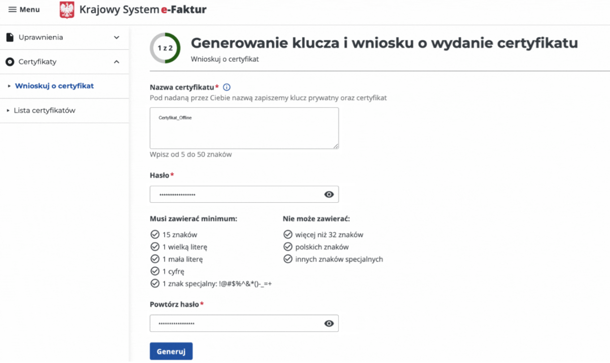 Wypełnij dane certyfikatu. Wymagane jest wprowadzenie Nazwy certyfikatu oraz utworzenie Hasła, które będzie zabezpieczać klucz prywatny oraz Powtórz hasło. Wybierz opcję Generuj. Klucz prywatny zostanie automatycznie zapisany na Twoim urządzeniu jako plik z rozszerzeniem .key.