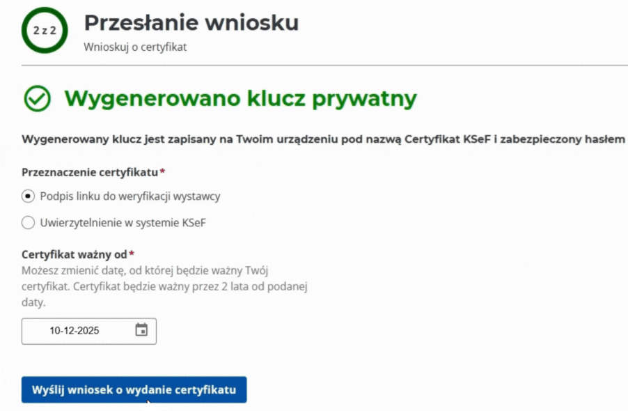Klucz prywatny zostanie automatycznie zapisany na Twoim urządzeniu jako plik z rozszerzeniem .key (np. moj_certyfikat.key).