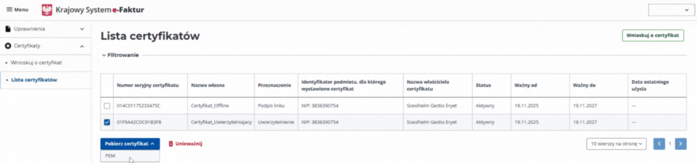 Certyfikaty można pobierać tylko, gdy mają status Aktywny (wydany i ważny). Zaznacz checkbox przy certyfikacie (możesz pobrać 1 – 10 certyfikatów jednocześnie). Przy większej liczbie użyj filtrów, aby zawęzić listę. Po zaznaczeniu co najmniej jednego certyfikatu przycisk Pobierz certyfikat stanie się aktywny - wybierz format PEM.
