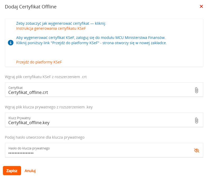 Wgraj certyfikat w formacie .crt, który został wygenerowany w Module Certyfikatow i Uprawnień z przeznaczeniem certyfikatu do Uwierzytelnienia w systemie KSeF. Załącz klucz prywatny w formacie .key. Wprowadź również Hasło do klucza prywatnego, które zostało zdefiniowane podczas generowania certyfikatu oraz zapisz zmiany.