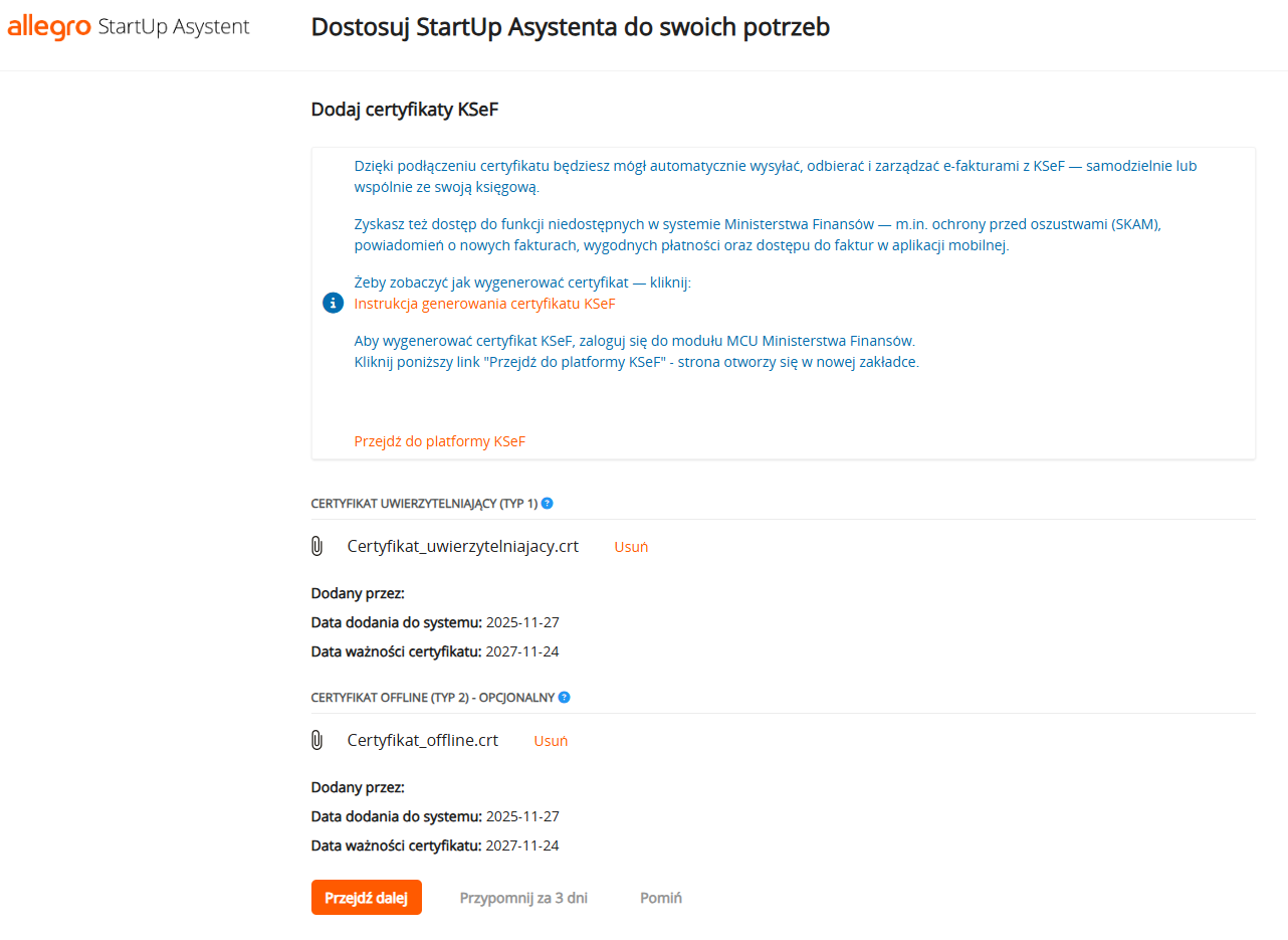 Na koniec wybierz opcję Przejdź dalej. Gotowe. System Allegro StartUp Asystent jest już połączony z KSeF.